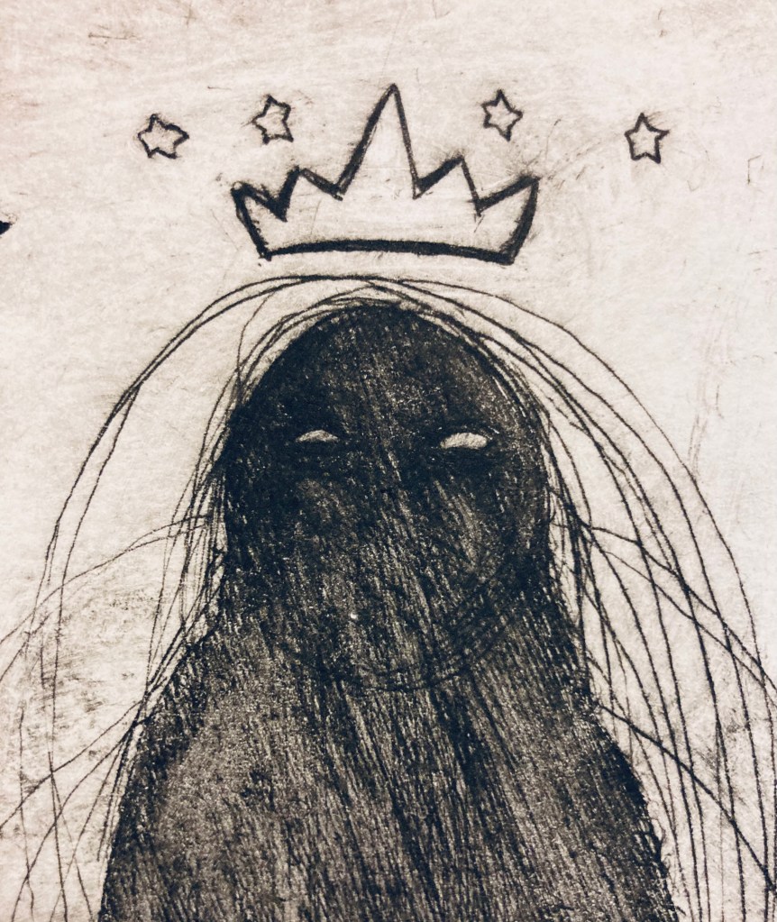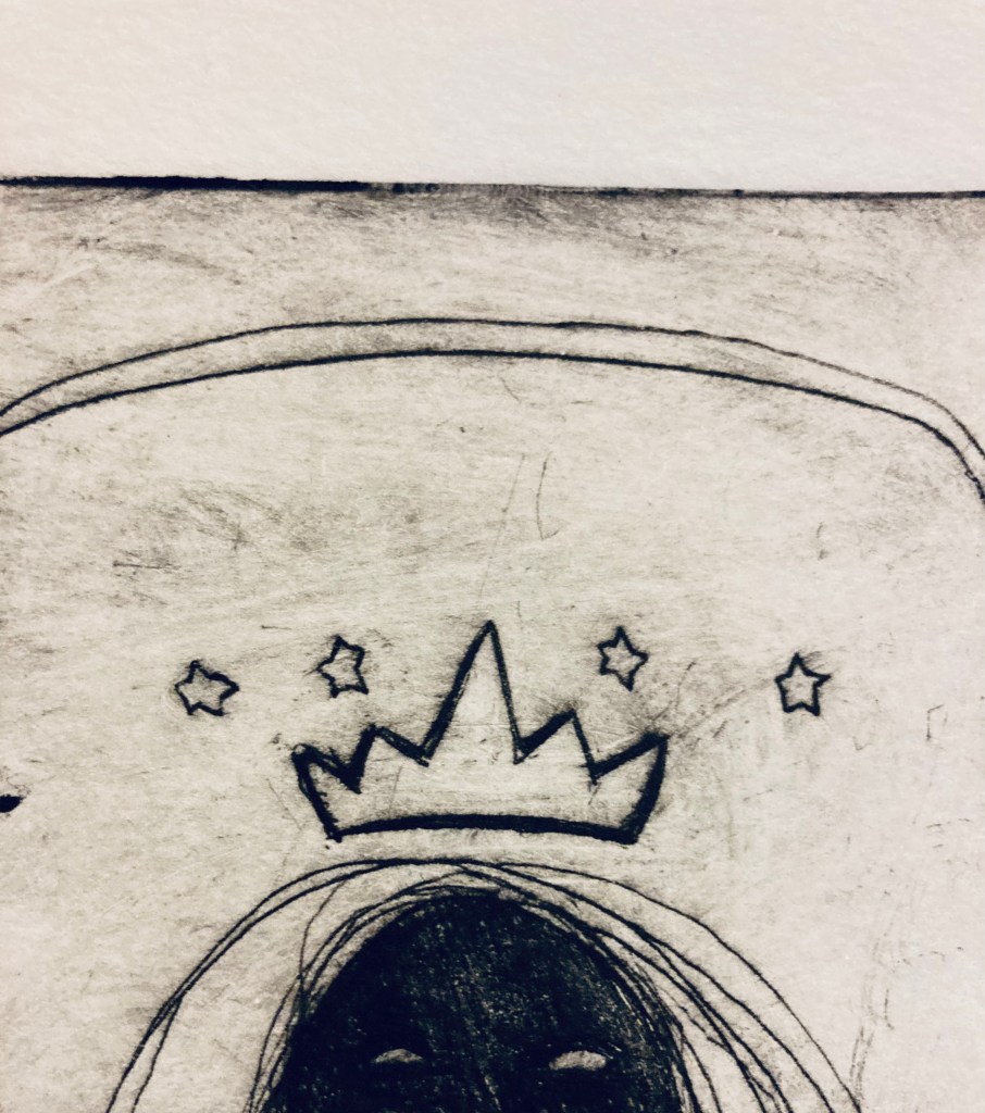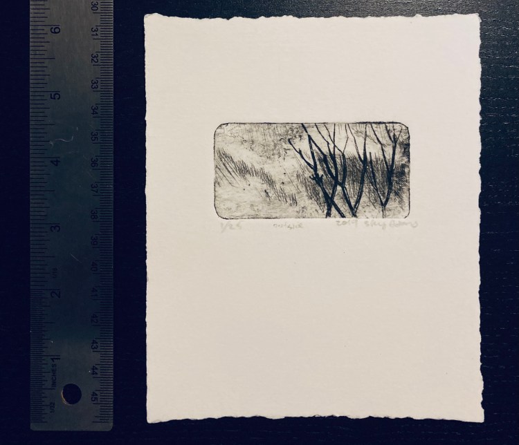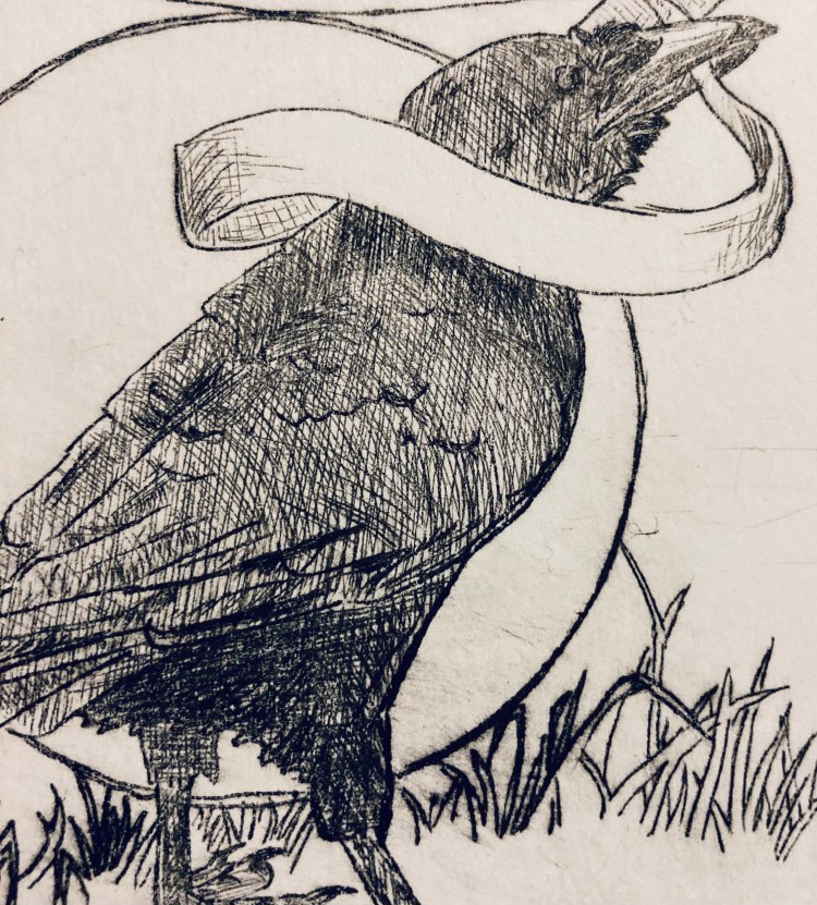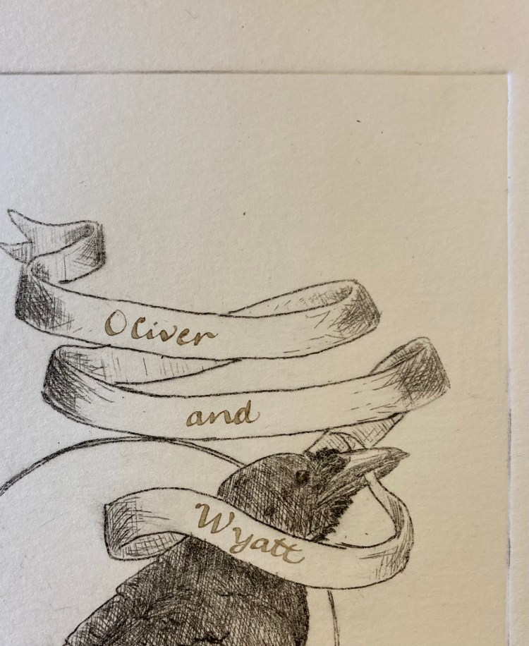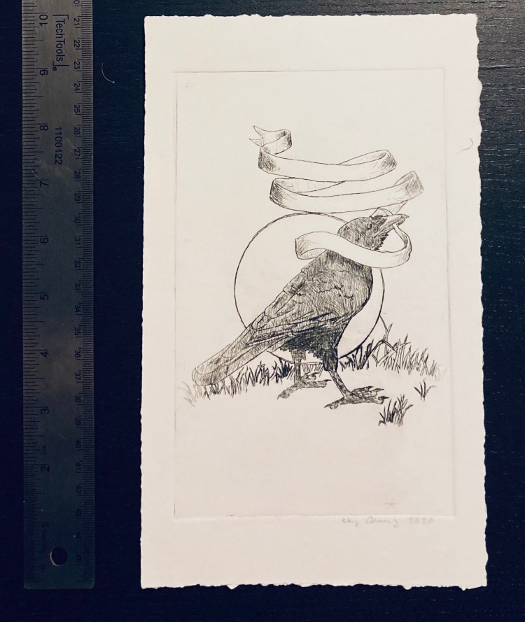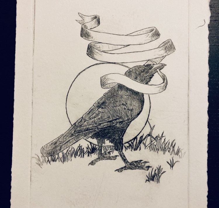 Talking crow 10×6 intaglio of a crow with a blank ribbon in its beak. (It can be filled out by me or by you!!)