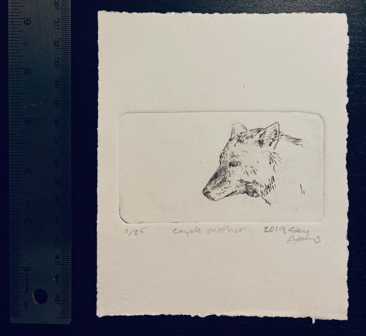 Coyote mother 6×5 intaglio of a coyote. (More info about coyotes here.)