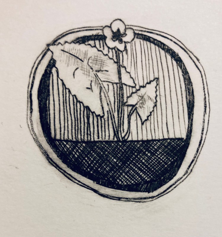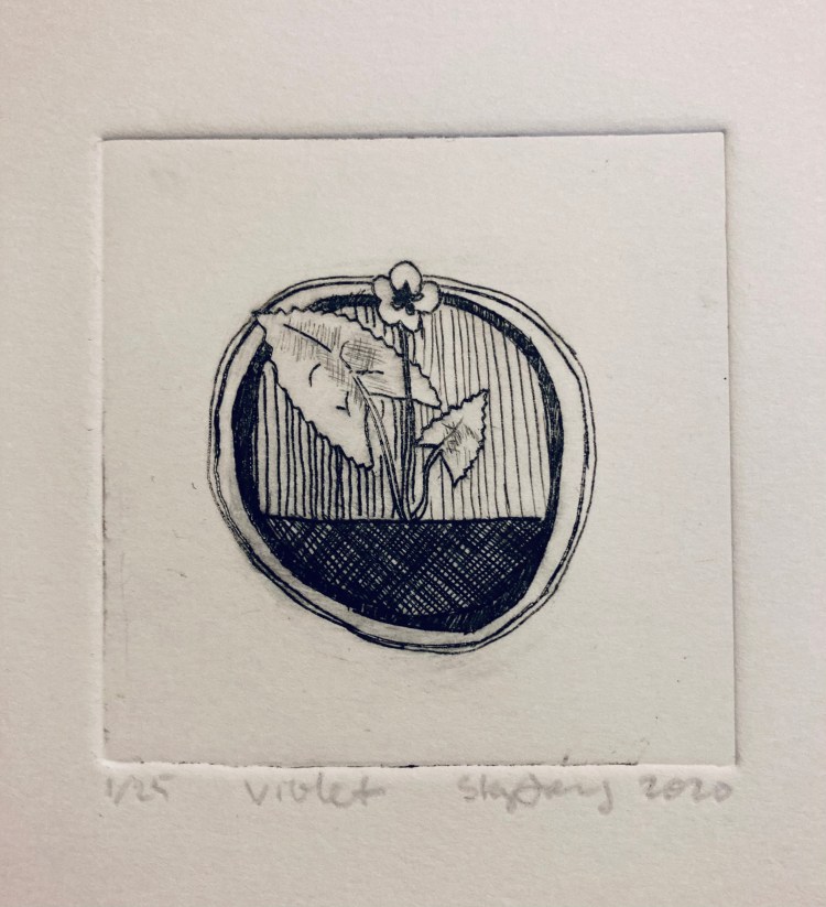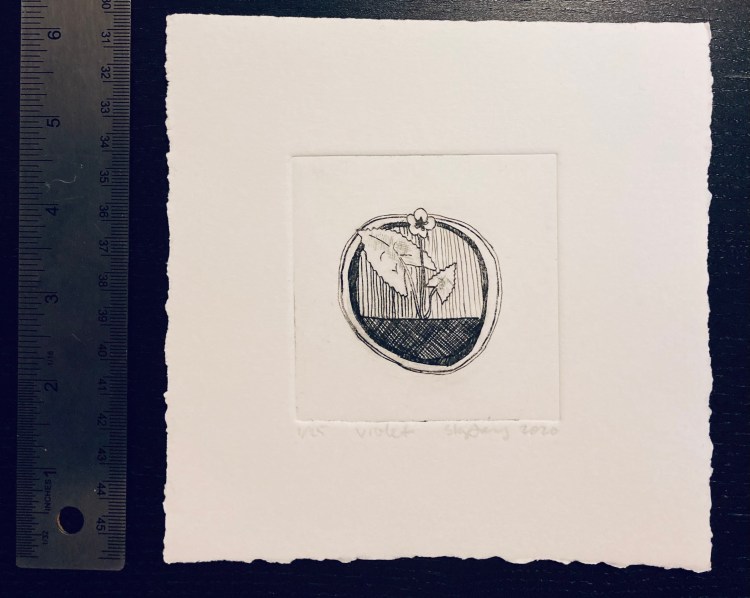 Violet 6×6 intaglio of a stylized violet flower. (More information on violets here.)