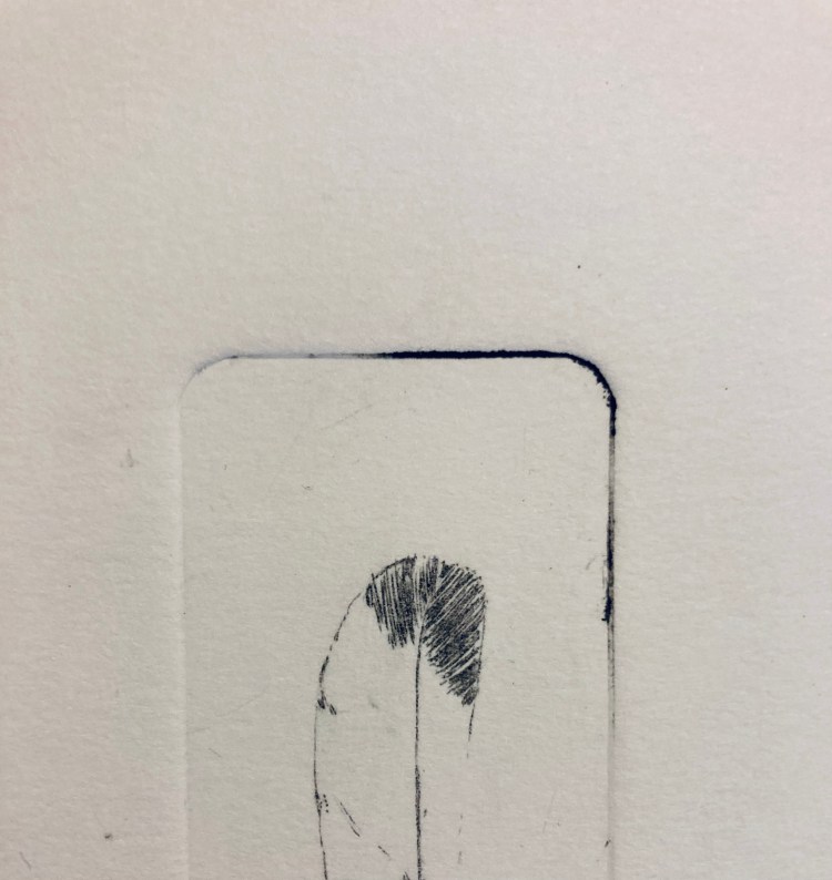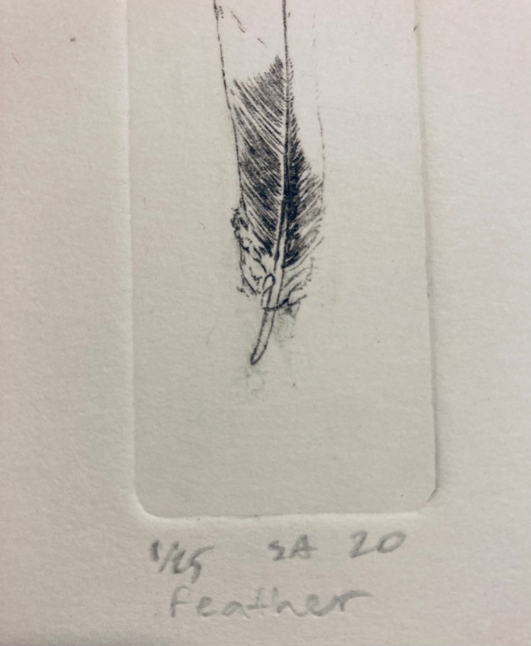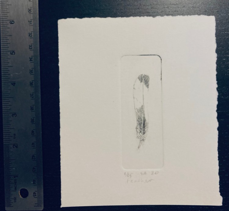 Feather 6×5 intaglio of a nuthatch feather (more on nuthatches here.)
