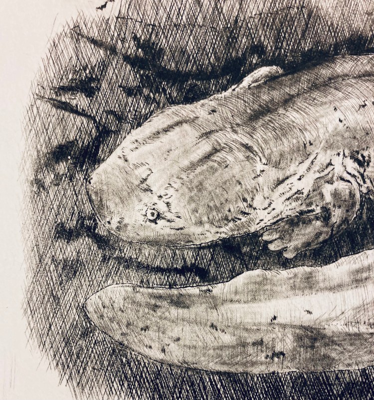 Hellbender 6×10 intaglio of a hellbender. (More info hellbenders here.)