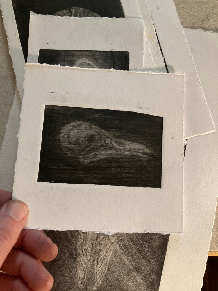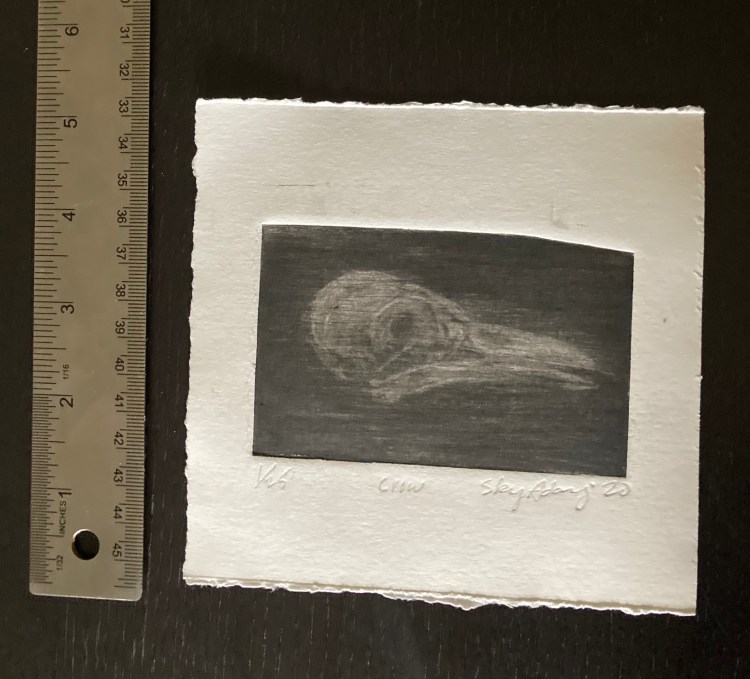Crow skull a 5×6 mezzotint of a crow skull