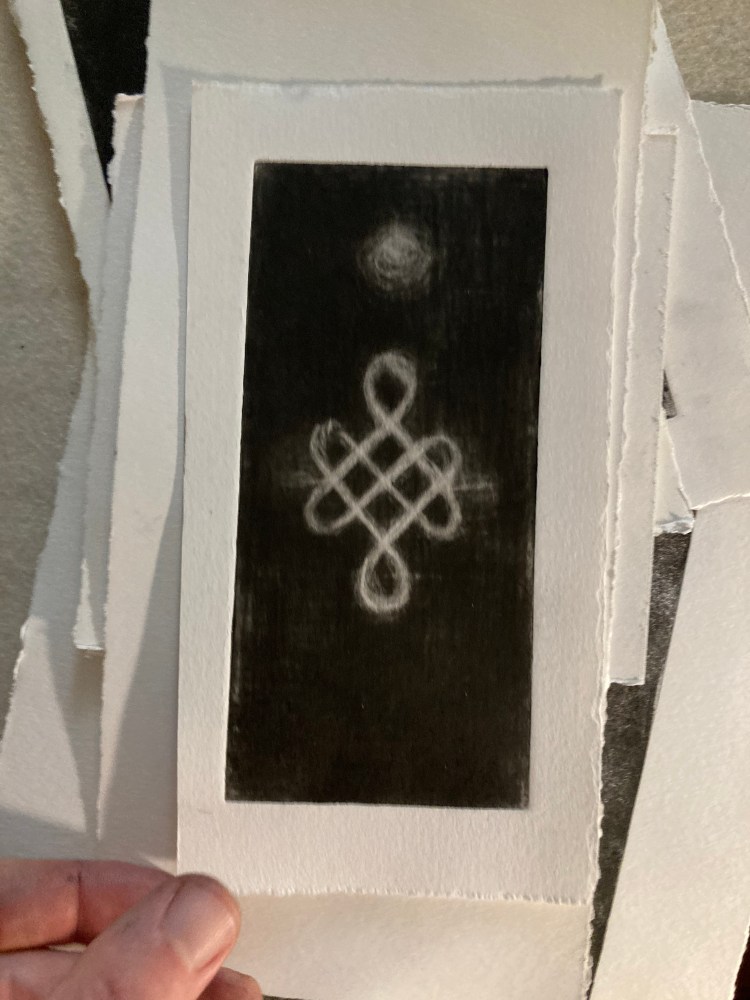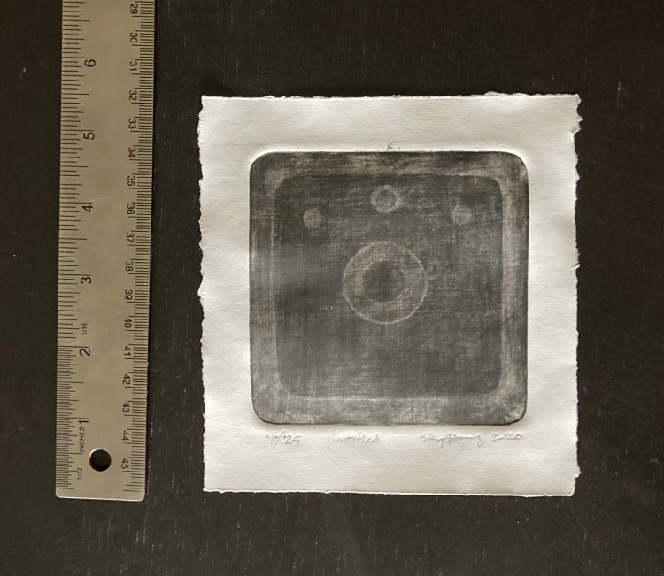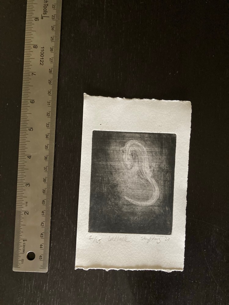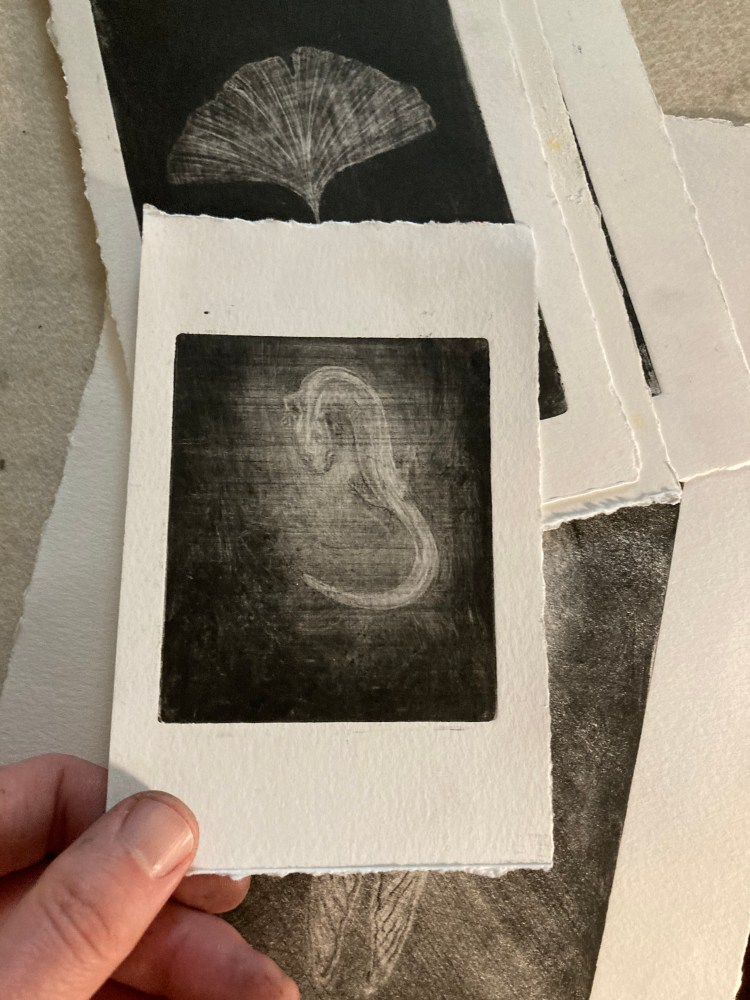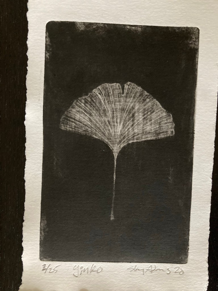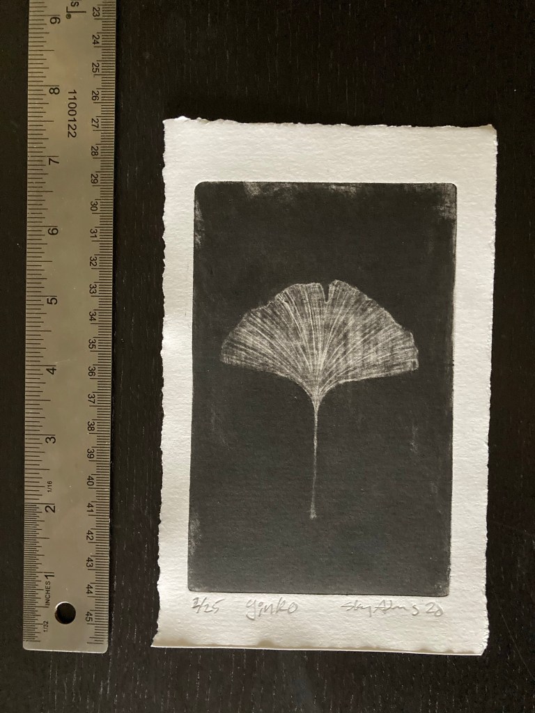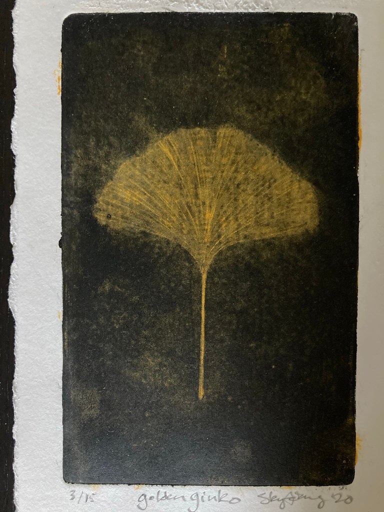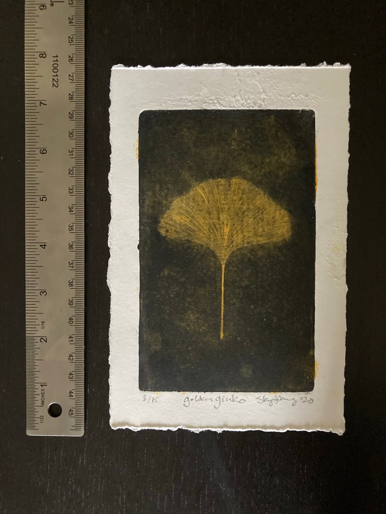 Golden ginkgo 8×5 mezzotint of a ginkgo leaf under printed with a separate yellow plate. (Learn more about ginkgo here.)