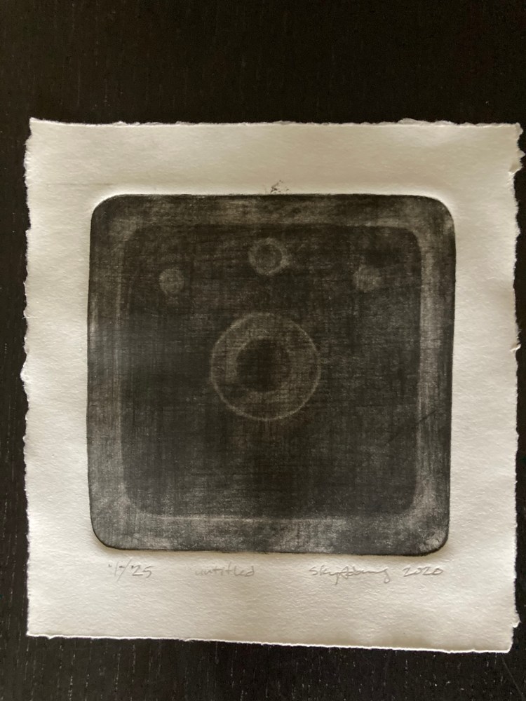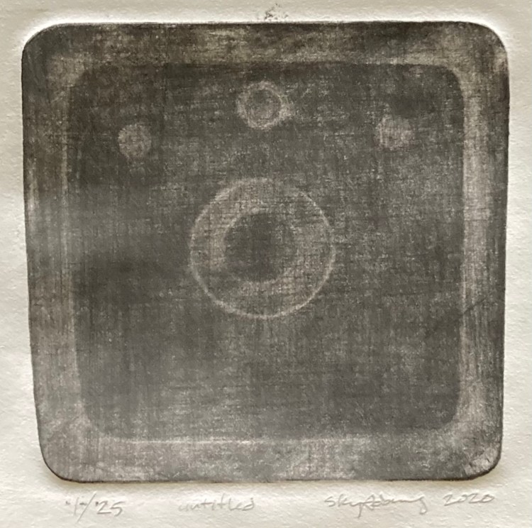 Untitled 5 1/2 x 5 1/2 mezzotint image of group of circles in a dark field.