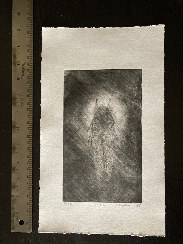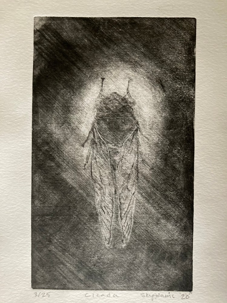 Cicada 12×7 mezzotint of a 17 year periodic cicada backlit by a a gentle glow. Indiana’s Brood X emerges in 2021.