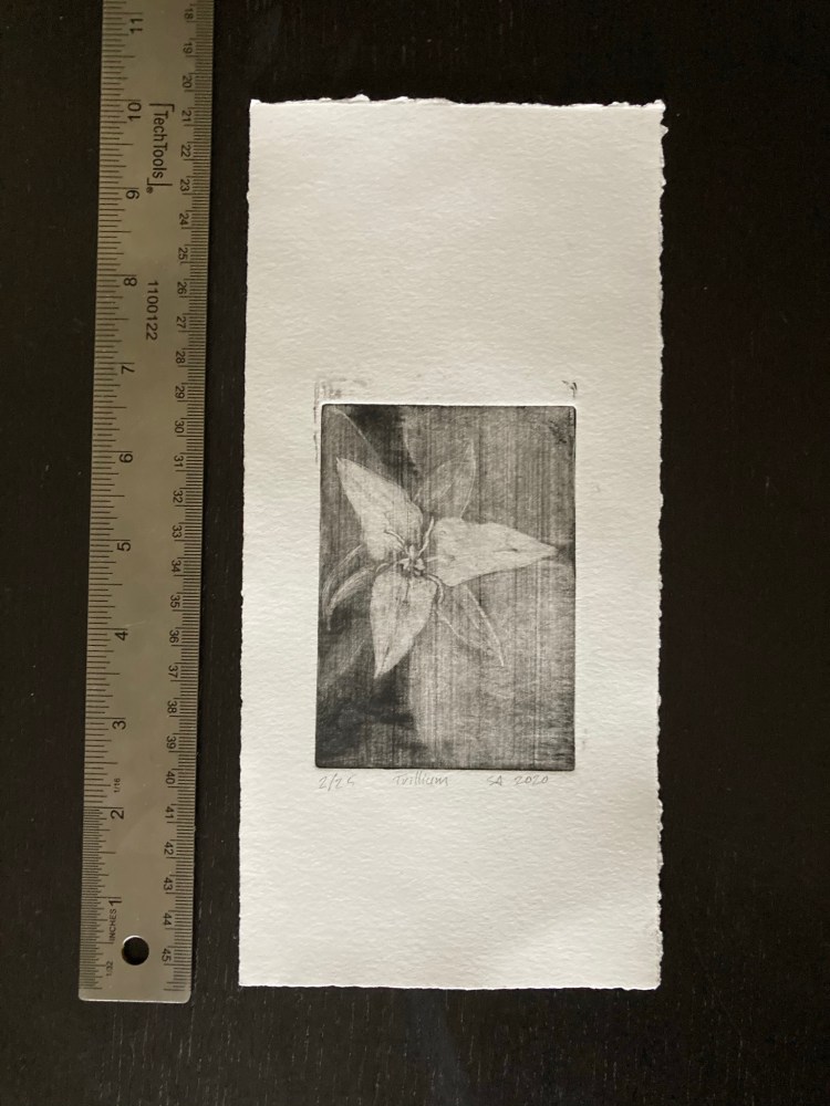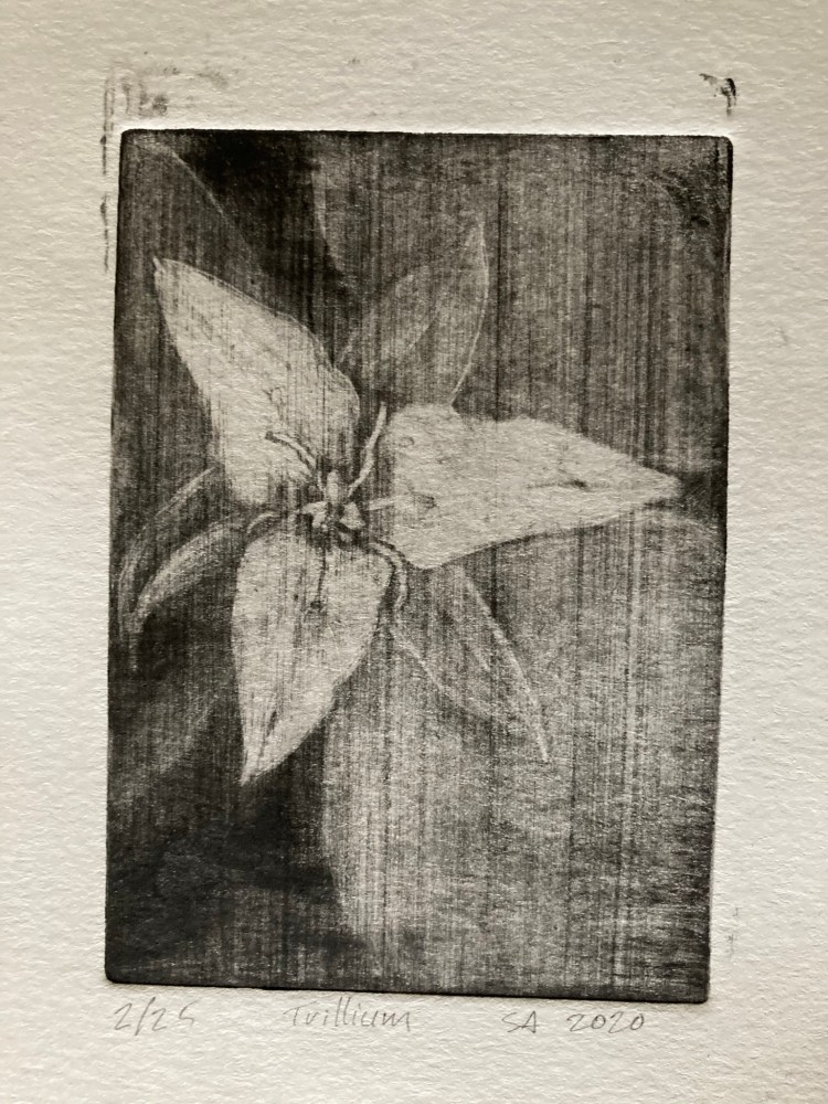 Trillium 10×5 mezzotint print of nodding white trillium. (Learn more.)